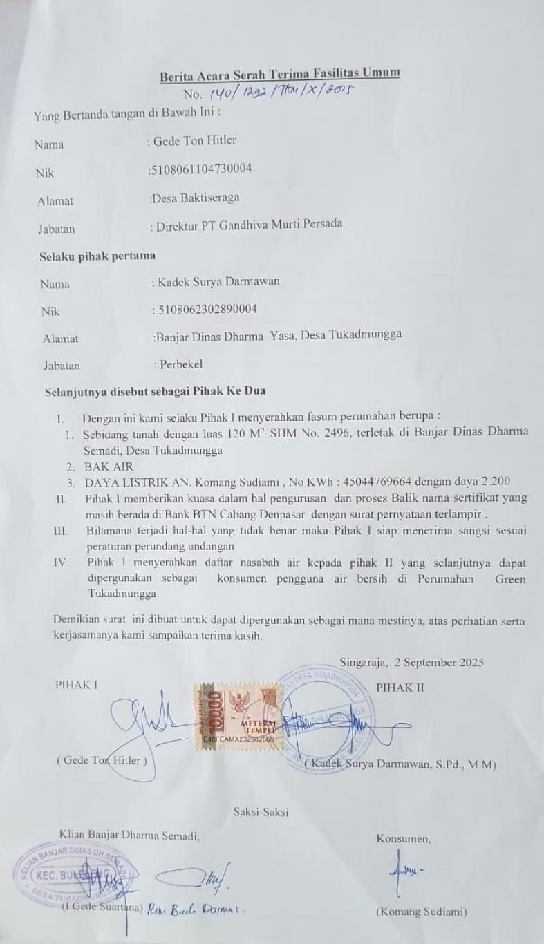 Perbekel Desa Tukadmungga melaksanakan kegiatan serah terima dan penandatanganan penghibahan tanah dari pihak ke-3 untuk pemerintah desa dengan luas 120m2 yang terletak di jalan Angling Dharma Banjar dinas dharma semadi desa Tukadmungga dan kami serahkan pengelolaannya kepada BUMDES agar bisa digunakan untuk hal yang bermanfaat ke depan nya.